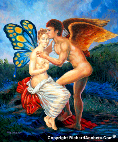 Fantasy serenade figure painting, male with bird wings and lady with the butterfly wings - oil painting by Richard Ancheta.